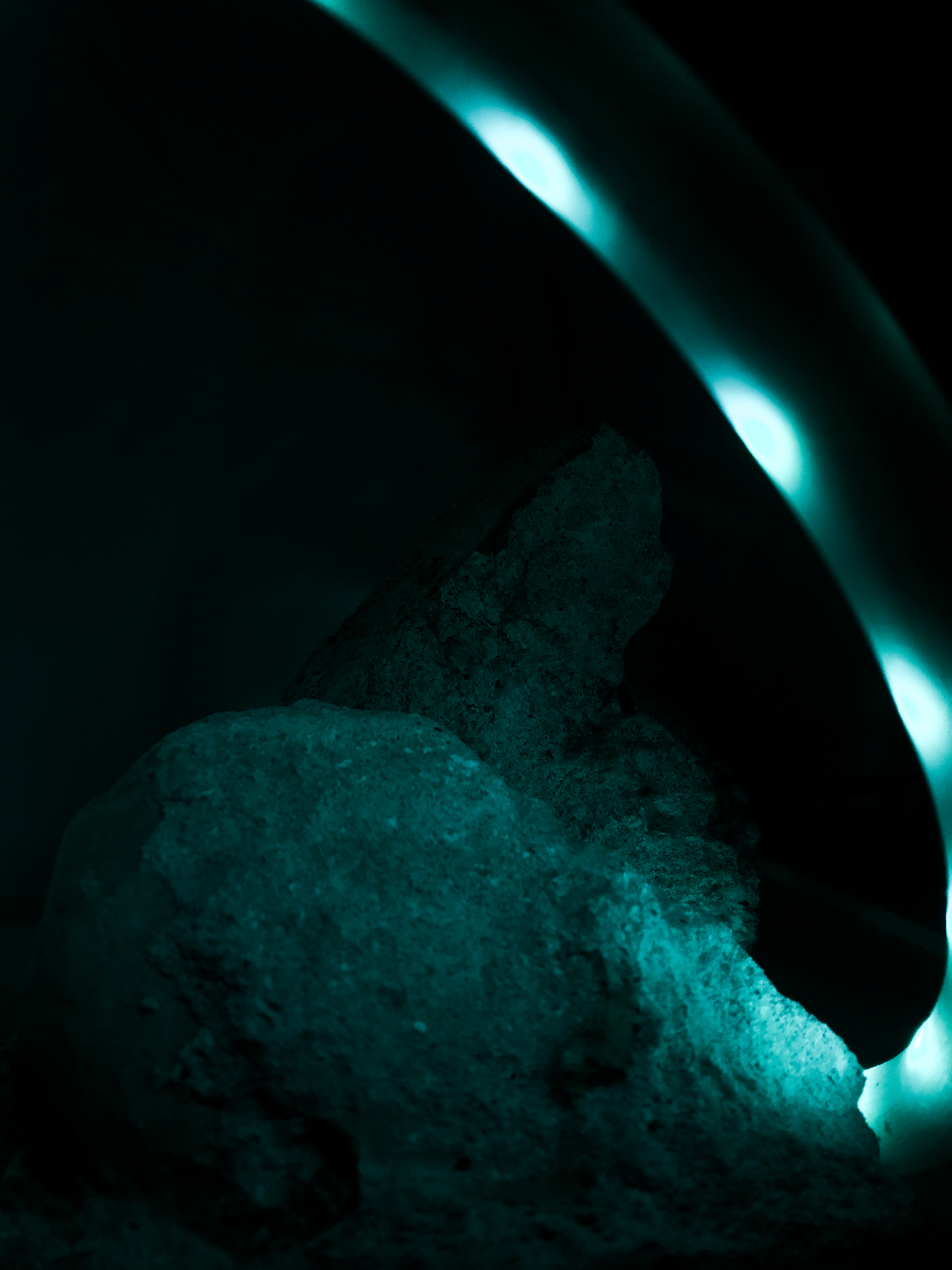 The installation consists of a number of found stones. It is illuminated by one LED strip, which is in a pump tube. The interaction is controlled by an Arduino.
