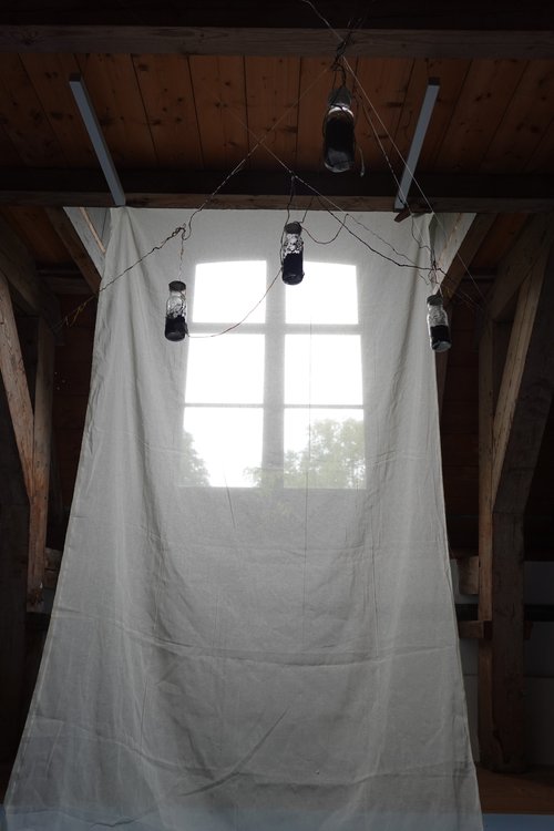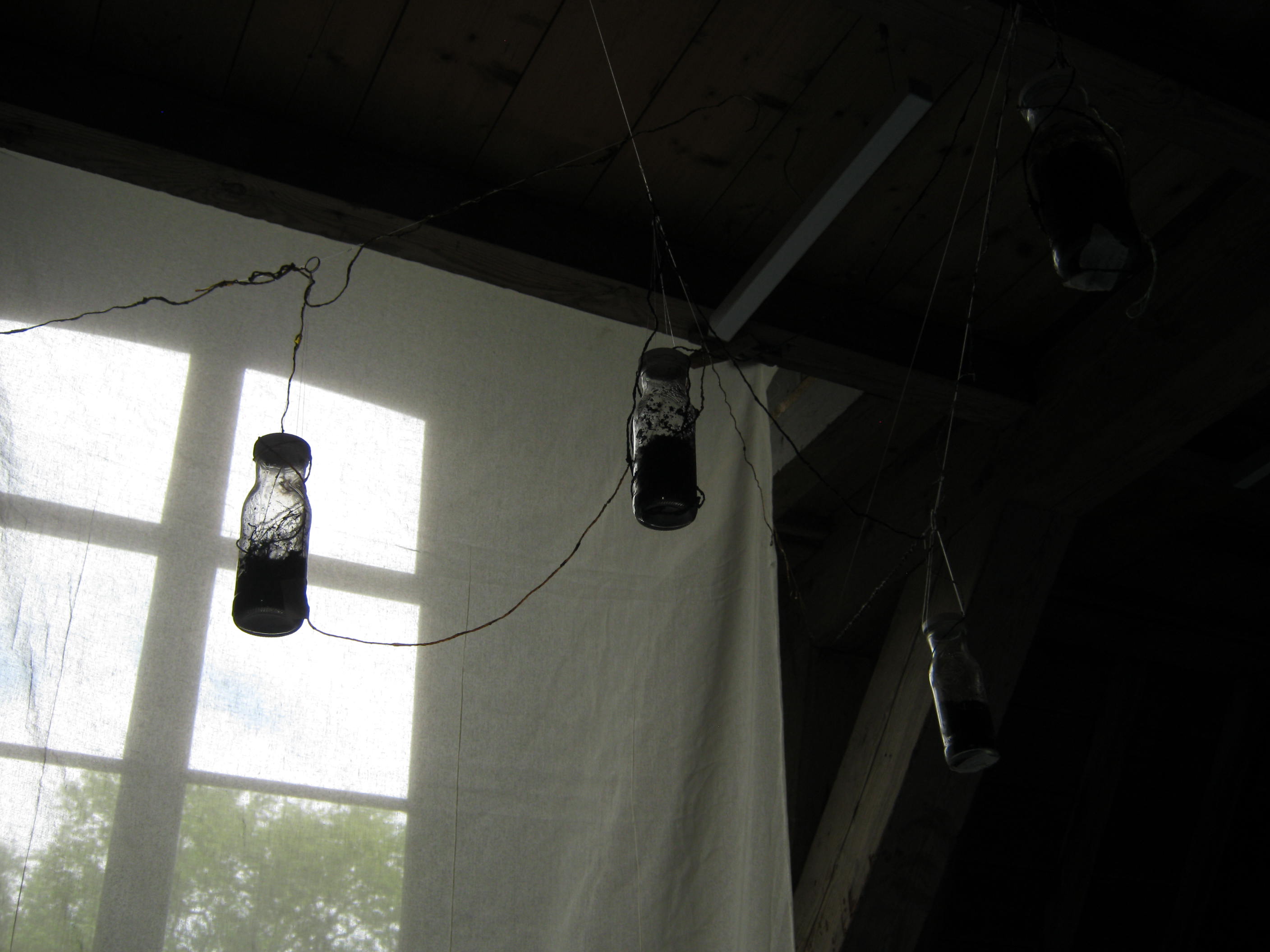 In "Tales in Dirt" ARDEMAR and Esther van Leeuwen, create their own "natural reality", exposing the lack of biodiversity of Dutch manmade nature. The artists collected many soil samples from different areas of Utrecht. These samples are stored in enclosed environments that are allowed to grow whatever seeds and plants that are contained in them, allowing them to grow without any human interaction, a thing that this soil hasn't done for centuries. These are hanged from the ceiling from handmade natural fiber so that people can better observe and immerse themselves with the “environment.” A pair of headphones playing unaltered field recordings of where the soil samples were recorded is also available to further immerse the public.